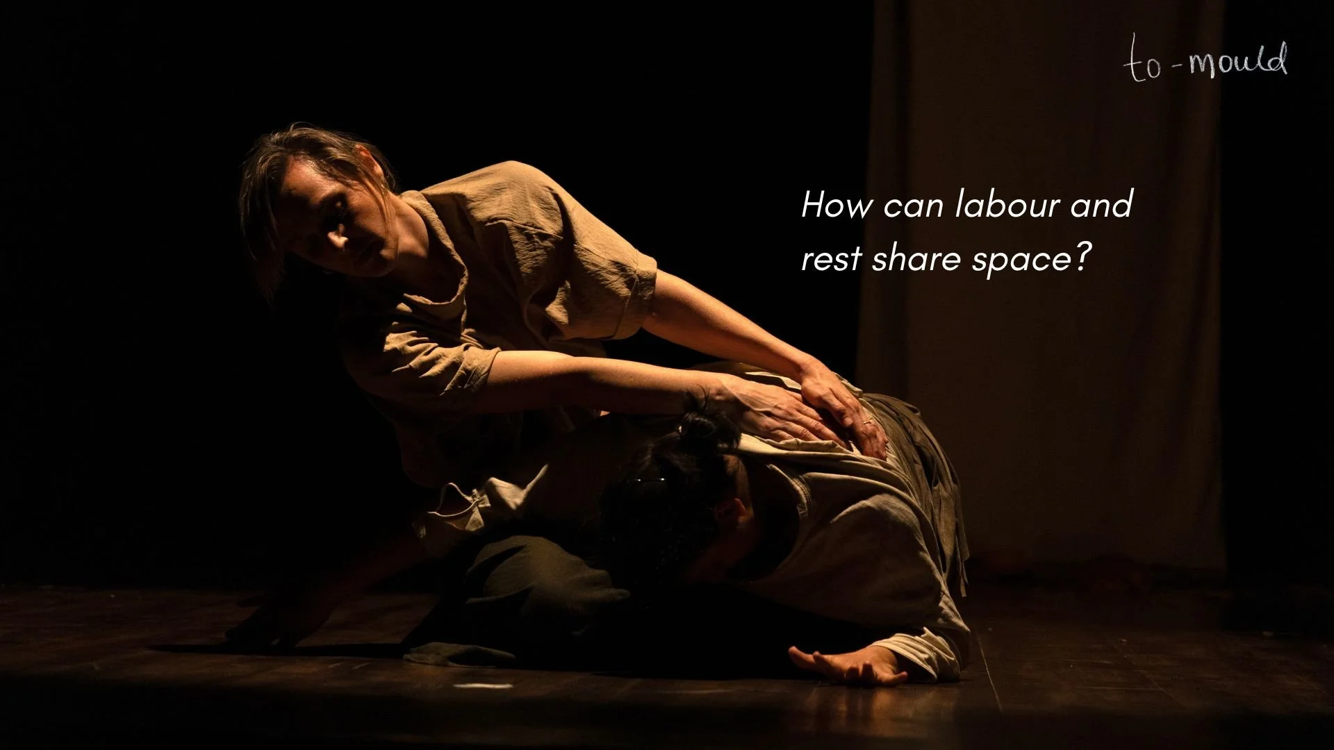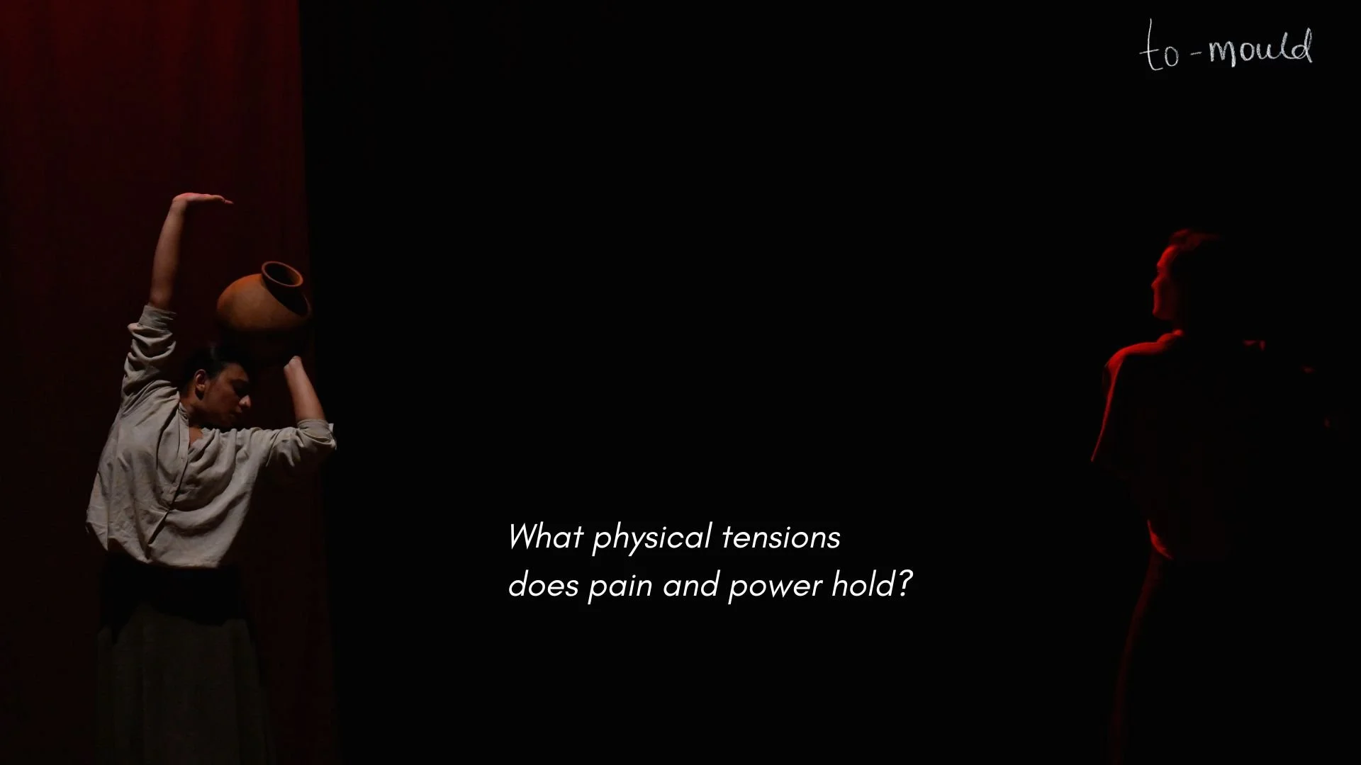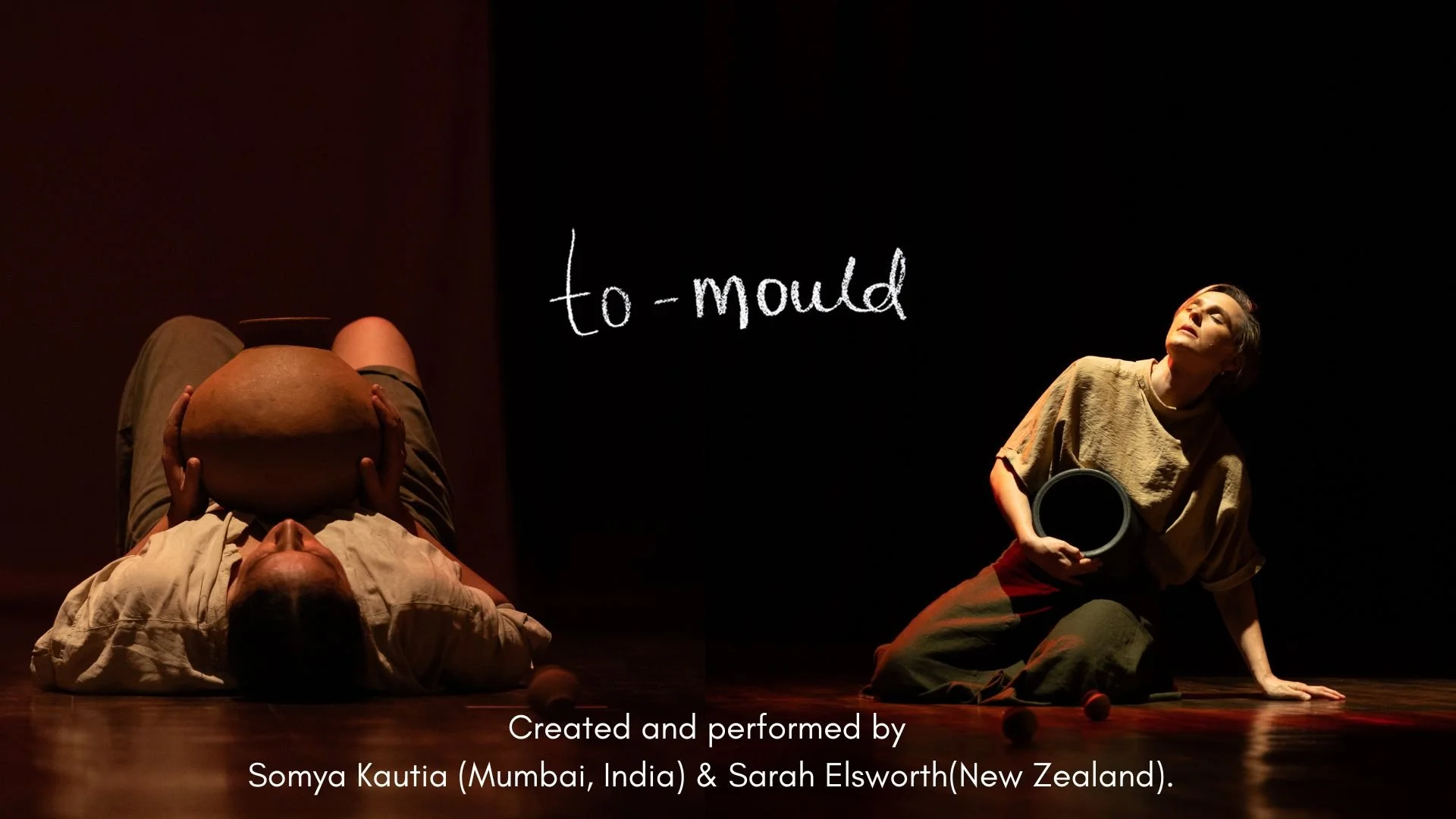 to-mould A duet anchored in the movement qualities of earthen pots and their ritualistic and sculptural connections to the female body.A vessel, ancient, ritualistic, and sculptural, the pot echoes the female body, both carriers of memory and resilience, moulded and transformed in a cyclical pattern. Developed into a full length duet To Mould (2025)supported by the G5A Warehouse Performance Grant.